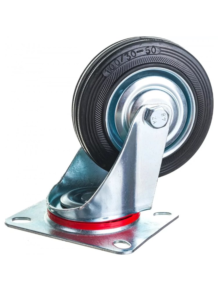 Применяется для транспортировки грузов средней степени тяжести. Колесо поворотной опоры оснащено роликовым подшипником. Данная серия колесных опор отлично адаптирована к эксплуатированию в помещениях и на грубой уличной поверхности. Обод поворотного колеса изготовлен из высокопрочной стали и оцинкован. Сама шина колеса выполнена из черной резины высокого качества, которая справляется с различными воздействиями внешней среды и поглощает вибрации и шум. Рекомендуемая скорость транспортировки груза на тележке с данным видом колес не более 4 км/ч. Заводской температурный режим для данной серии варьируется между -25С° и +50С°. В качестве крепления использована площадка. Используются для складских тележек, платформенных тележек, мусорных баков небольшой емкости, для строительных лесов, стеллажей, железной мебели. Поворотная колесная опора 100 мм выдерживает до 70 кг, обеспечивает бесшумное движение, защиту пола и легкий монтаж, для мобильных конструкций.