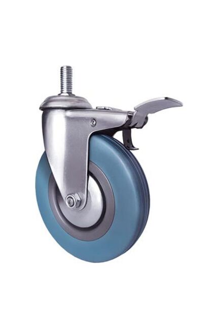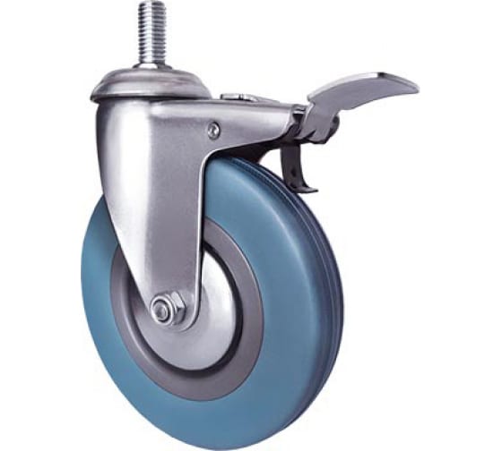 Колесная опора с серой резиной поворотная с болтовым креплением 50 мм адаптирована для работы в помещениях. Серая резина обладает очень мягким ходом и является достаточно маневренной. Данная опора оснащается двухрядным шарикоподшипником и имеет втулку скольжения оси. Шинка колесной опоры серая резина изготавливается из полипропилена серого цвета, чьей особенностью является шумопоглощение, малая вибрация и отсутствие следов на поверхности. Эта серия колес часто применяется при изготовлении медицинского передвижного оборудования, различных деталей мебели, складских тележек. Заводской температурный режим для данной серии варьируется между -20С° и +50С°. В качестве крепления использован болт, который выполнен из специальной стали с оцинковкой. Тормоз, предусмотренный конструкцией, в случае необходимости обеспечивает неподвижность конструкции. Колеса малой грузоподъемности, используются на медицинской мебели в основной и там где изделие катается по кафелю или плитке, чтобы не оставлять сле Поворотная колесная опор
