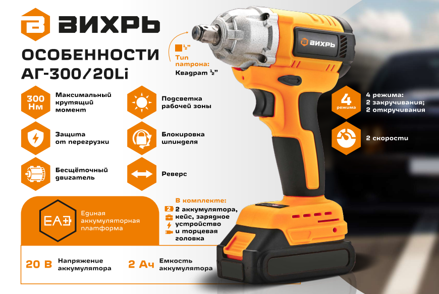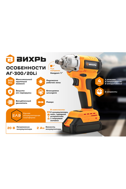 Гайковерт акк. ВИХРЬ АГ-300/20Li 20В, 300 Нм, 2*2Ач, бесщеточный, кейс
