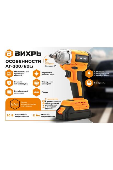 Гайковерт акк. ВИХРЬ АГ-300/20Li 20В, 300 Нм, 2*2Ач, бесщеточный, кейс в Комсомольск-на-Амуре