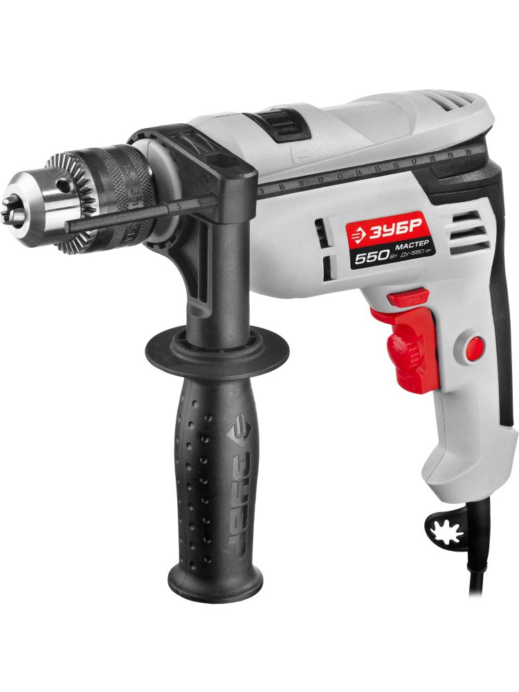 Ударная дрель Зубр МАСТЕР работает с такими материалами, как дерево, сталь, кирпич, легкий бетон. Ключевой патрон предусматривает надежное закрепление оснастки. Реверс помогает освободить застрявшее сверло или, например, отвернуть крепко засевший шуруп. Регулировка числа оборотов позволяет подобрать нужную частоту вращения в зависимости от вида работ и материала. Наличие функции удара позволяет сверлить бетон диаметром до 13 мм. Мощная ударная дрель 550 Вт с реверсом, подойдет для сверления бетона, кирпича, металла и дерева. Удобна для дома, мастерской и стройки.