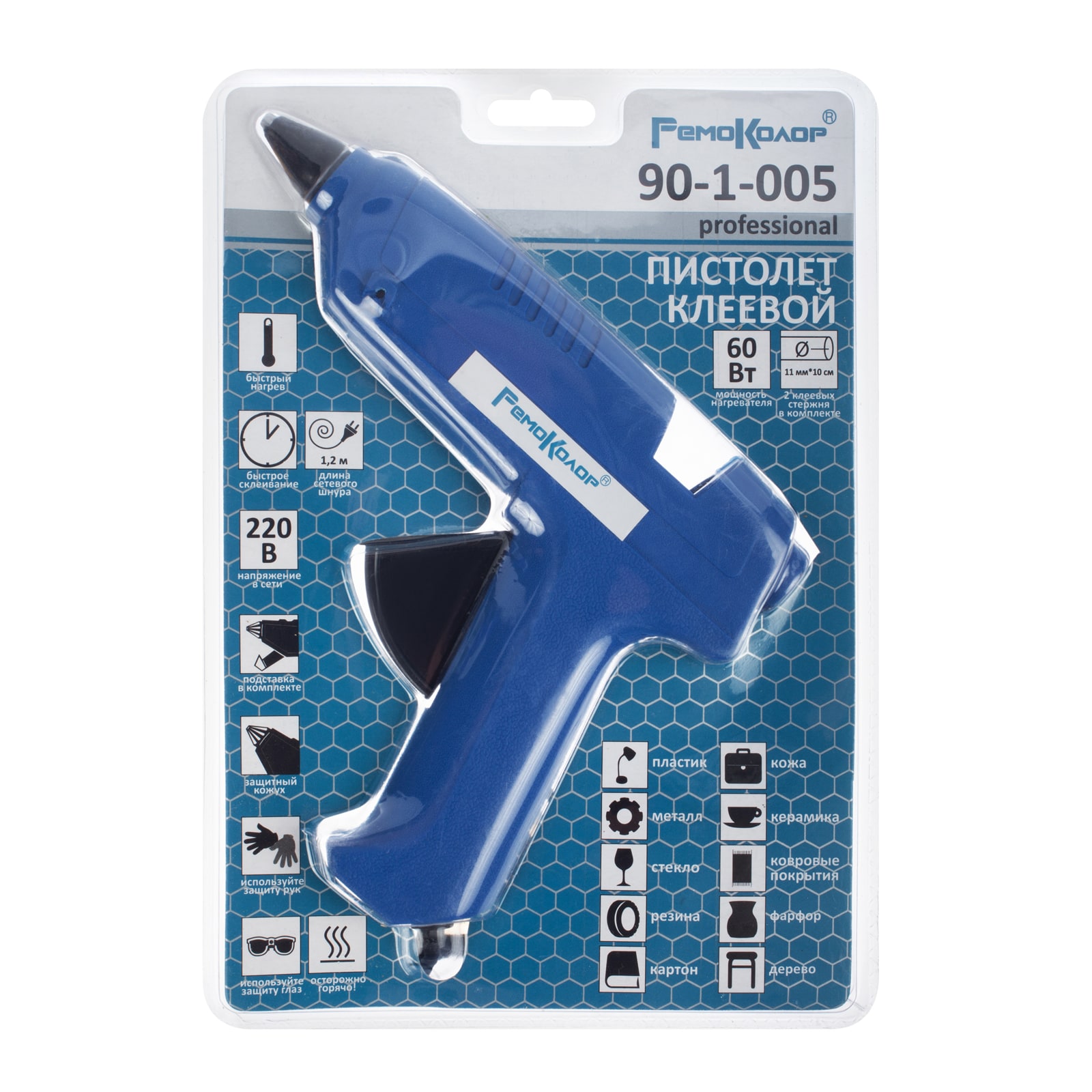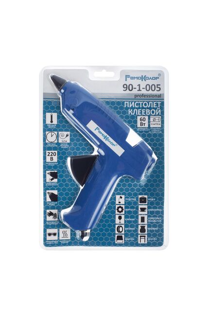 Предназначен для разогрева клеевого стержня диаметром 11 мм при проведении несложных бытовых работ: склеивания бумаги, дерева, пластика и других материалов. Мощность нагревателя 60 Вт. Длина сетевого кабеля 1,2 м. Быстрый нагрев и склеивание. Пистолет имеет защитный кожух и пластиковую складную подставку. Клеевые стержни в комплекте. Материал: корпус пистолета - полибутилентерефталат (РВТ), пластик, нагревательный элемент - терморезистор (РТС).