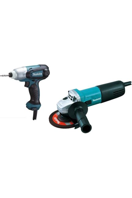 Набор Makita DK0169 включает в себя ударный шуруповерт TD0101 и углошлифовальную машину 9555HN. Ударный шуруповерт Makita TD0101 предназначен для заворачивания и выворачивания шурупов, также его можно использовать при сверлении. Наличие окружного удара позволяет развивать момент затяжки до 100 Нм. Дополнительные характеристики Мощность: 230 Вт Крепежный винт - М4-М10 Стандартный болт - М5-М14 Высокопрочный болт - М5-М10 Длина закручиваемого винта с крупной резьбой до 90 мм Углошлифовальная машина Makita 9555HN может применяться в строительных работах для шлифовки, резки или очистки металлических изделий. Инструмент оснащен двигателем мощностью 710 Вт, защищенным от пыли, и диском диаметром 125 мм. Небольшие габариты и малый вес позволяют работать инструментом одной рукой. Дополнительные характеристики Мощность: 710 Вт Диаметр диска: 125 мм Число оборотов: 10000 об/мин Мощный набор: УШМ 710 Вт (125 мм) и ударный шуруповерт 100 Нм — для быстрой сборки, монтажа и резки разн
