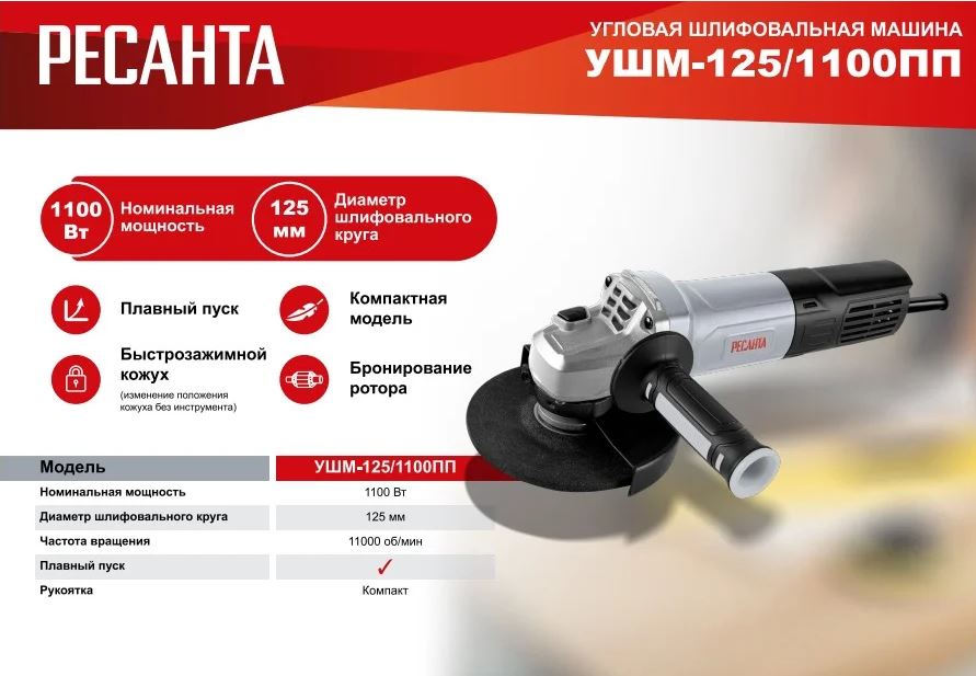 1100 Вт, диаметр диска 125 мм, плавный пуск, удобная рукоятка и над