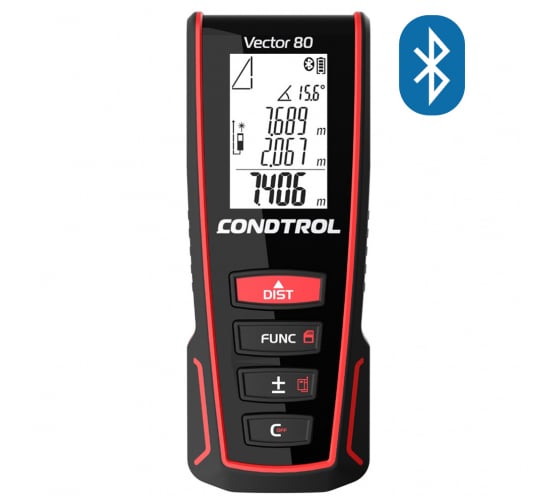 Лазерный дальномер Condtrol Vector 80 используется строителями, отделочниками, монтажниками и прочими мастерами. Позволяет быстро измерить расстояние как в помещении, так и на улице. Прибор имеет большое количество функций: трекинг (непрерывное измерение), сложение/вычитание, вычисление площади и объема, вычисления по теореме Пифагора, вычисления при помощи датчика наклона, вычисление расстояния между двумя точками. Измерения могут проводиться с передней или задней стенки корпуса, со штатива, откидной скобы. Встроенная функция Bluetooth дает возможность передавать полученные результаты на смартфон или планшет.