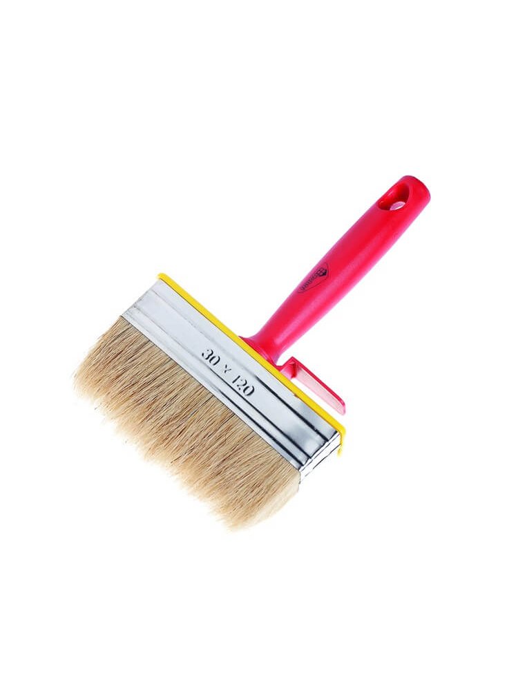 Профессиональный инструмент для малярных работ и ремонта — широкая кисть с натуральной щетиной и удобной пластиковой ручкой быстро наносит краску, клей или грунтовку на большие поверхности. Идеальна для работы внутри и снаружи помещений.