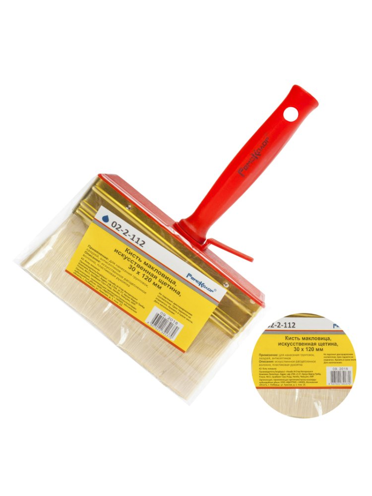 Искусственная белая щетина 100%. Кончики щетины на конце расщеплены для лучшей впитываемости краски. Бандаж изготовлен из жести порытой лаком. Для надежного удержания щетины используется клей на эпоксидной основе и деревянные клинья. Рукоятка изготовлена пластика. Назначение: Предназначена грунтовок, лазурей и антисептиков. Используется для работы на больших площадях. Широкая макловица 30х120 мм с синтетической щетиной, пластиковой ручкой и креплением — для быстрой покраски и грунтовки больших поверхностей.