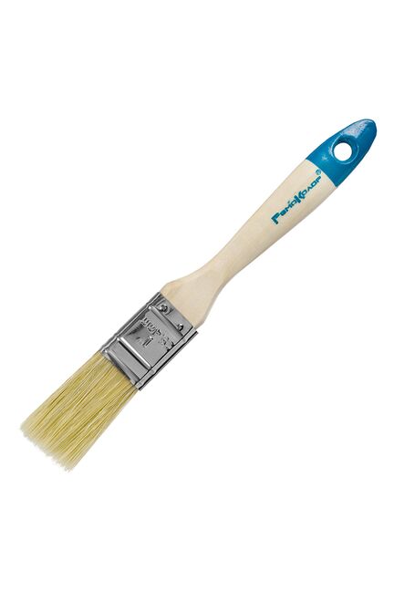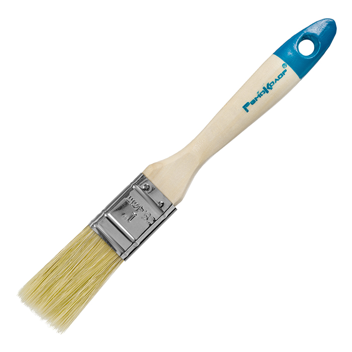 Натуральная светлая щетина. Предназначена для всех типов лакокрасочных материалов. Кончики щетины на конце расщеплены для лучшей впитываемости краски. Бандаж изготовлен из жести. Для надежного удержания щетины используется клей на эпоксидной основе и деревянные клинья. Рукоятка деревянная покрыта лаком. Кончик кисти окрашен цветной краской. Плоская кисть 25 мм с натуральной щетиной — для точной и аккуратной покраски лакокрасочными материалами. Удобна, долговечна, минимальное выпадение ворса.