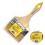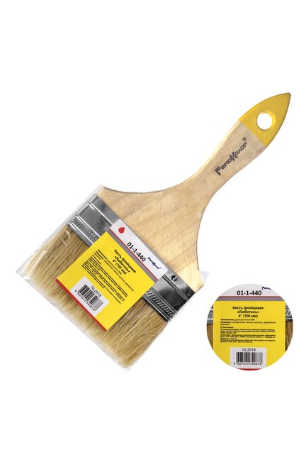 Натуральная светлая щетина. Предназначена для всех типов лакокрасочных материалов. Кончики щетины на конце расщеплены для лучшей впитываемости краски. Бандаж изготовлен из жести. Для надежного удержания щетины используется клей на эпоксидной основе и деревянные клинья. Рукоятка деревянная отшлифована, не покрыта. Кончик кисти окрашен цветной краской. Плоская кисть с натуральной щетиной шириной 101 мм для качественного нанесения красок и лаков, удобна для больших поверхностей, долговечна.