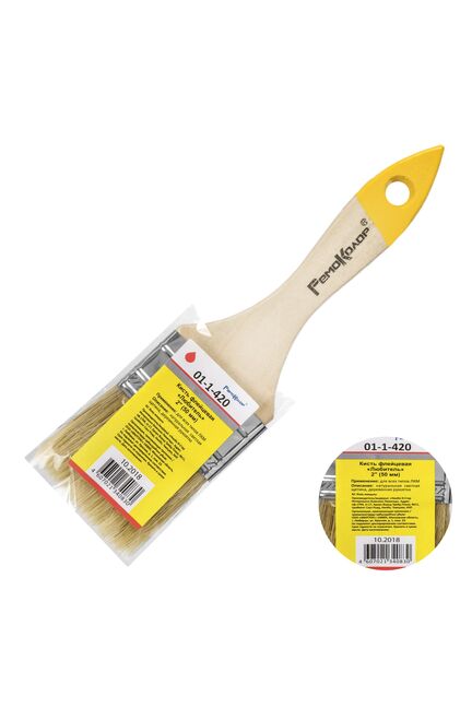 Натуральная светлая щетина. Предназначена для всех типов лакокрасочных материалов. Кончики щетины на конце расщеплены для лучшей впитываемости краски. Бандаж изготовлен из жести. Для надежного удержания щетины используется клей на эпоксидной основе и деревянные клинья. Рукоятка деревянная отшлифована, не покрыта. Кончик кисти окрашен цветной краской. Плоская кисть 50 мм с натуральной щетиной для аккуратного нанесения красок и лаков, подходит для работ внутри и снаружи помещений.