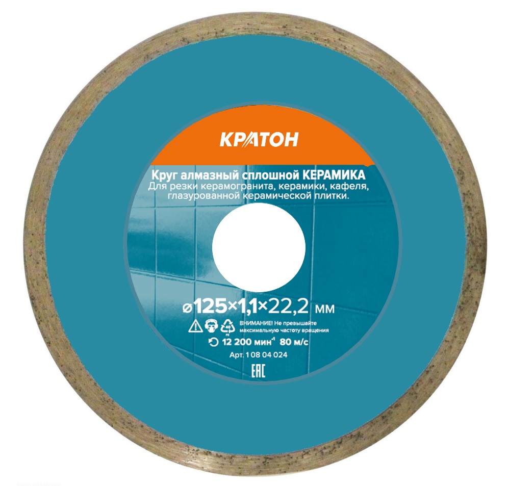 Круг алмазный сплошной супертонкий для УШМ (125 мм; 1.1 мм) Кратон предназначен для работы с керамогранитом, кафелем, глазурованной керамической плиткой и твердой керамикой. Точный алмазный диск 125 мм для чистого реза керамики и плитки без сколов, долговечен, подходит для УШМ, толщина 1,1 мм, посадка 22 мм.