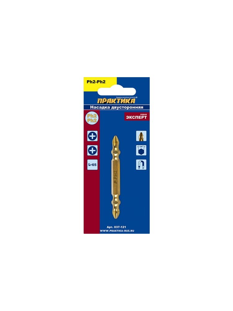 Насадки отверточные двусторонние. Магнитные. Серия "Эксперт". Отверточные насадки ПРАКТИКА серии «Эксперт» идеально подходят для профессионального применения. Улучшенная геометрия позволяет наиболее четко фиксировать насадку в шлице самореза, сводя до минимума вероятность срыва, что существенно увеличивает ресурс насадки и не повреждает шлицы и поверхность материала. Дополнительно для улучшения сцепления со шлицом при закручивании длинных саморезов на рабочую часть насадки нанесены специальные насечки (ACR) увеличивающие поверхность сцепления. Специальная хромванадиймолибденовая сталь (CrVMo) и температурная обработка токами высокой частоты (ТВЧ) обеспечивают наибольшую поверхностную твердость 60-61 HRC в сочетании с достаточной вязкостью острия насадки, что полностью исключает, как единовременное сворачивание насадки, так и ее излом. Покрытие нитридом титана (TiN) обеспечивает дополнительное упрочнение поверхности рабочей части насадки. Магнитные свойства позволяют удерживать саморез Двусторонняя PH2 бита 65