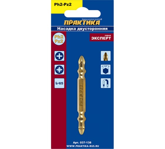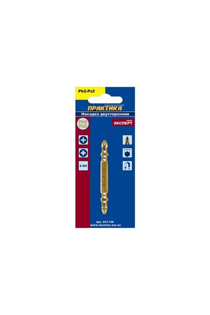 Насадки отверточные двусторонние. Магнитные. Серия "Эксперт". Отверточные насадки ПРАКТИКА серии «Эксперт» идеально подходят для профессионального применения. Улучшенная геометрия позволяет наиболее четко фиксировать насадку в шлице самореза, сводя до минимума вероятность срыва, что существенно увеличивает ресурс насадки и не повреждает шлицы и поверхность материала. Дополнительно для улучшения сцепления со шлицом при закручивании длинных саморезов на рабочую часть насадки нанесены специальные насечки (ACR) увеличивающие поверхность сцепления. Специальная хромванадиймолибденовая сталь (CrVMo) и температурная обработка токами высокой частоты (ТВЧ) обеспечивают наибольшую поверхностную твердость 60-61 HRC в сочетании с достаточной вязкостью острия насадки, что полностью исключает, как единовременное сворачивание насадки, так и ее излом. Покрытие нитридом титана (TiN) обеспечивает дополнительное упрочнение поверхности рабочей части насадки. Магнитные свойства позволяют удерживать саморез