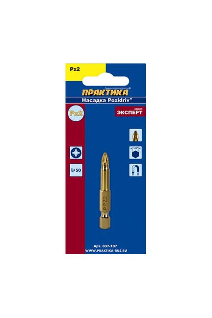 Насадки отверточные Pozidriv. Магнитные. Серия "Эксперт". Отверточные насадки ПРАКТИКА серии «Эксперт» идеально подходят для профессионального применения. Улучшенная геометрия позволяет наиболее четко фиксировать насадку в шлице самореза, сводя до минимума вероятность срыва, что существенно увеличивает ресурс насадки и не повреждает шлицы и поверхность материала. Дополнительно для улучшения сцепления со шлицом при закручивании длинных саморезов на рабочую часть насадки нанесены специальные насечки (ACR) увеличивающие поверхность сцепления. Специальная хромванадиймолибденовая сталь (CrVMo) и температурная обработка токами высокой частоты (ТВЧ) обеспечивают наибольшую поверхностную твердость 60-61 HRC в сочетании с достаточной вязкостью острия насадки, что полностью исключает, как единовременное сворачивание насадки, так и ее излом. Покрытие нитридом титана (TiN) обеспечивает дополнительное упрочнение поверхности рабочей части насадки. Магнитные свойства позволяют удерживать саморез в л Бита PZ-2 50 мм с титано