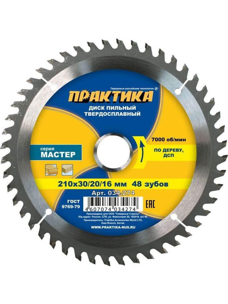 Пильные диски по дереву и ДСП. ГОСТ 9769-79. Серия "Мастер". Высококачественные пильные диски для ручных дисковых пил и станков. Твердость тела HRC 45-46, напаек из карбида вольфрама (сплав ВК8) HRC. 90-93. Угол атаки зуба + 15°. Точный и чистый рез древесины и ДСП, 48 зубьев, универсальный, подходит для разных пил, диаметр 210 мм, отверстия 30/20/16 мм.