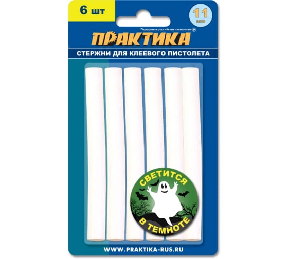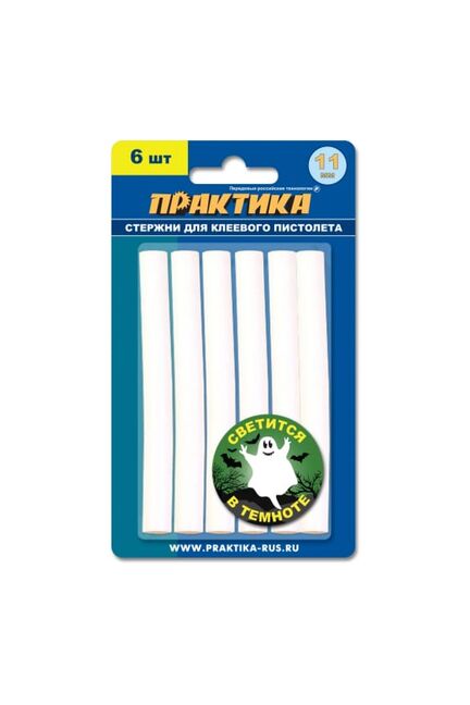 Клей белый светящийся в темноте (6 шт; 11х100 мм) для клеевого пистолета ПРАКТИКА предназначен для прочного соединения деталей из картона, полимерных материалов, пластиков, резины, линолеума, кожи, ткани, керамики, фарфора, стекла. Особенно подходят для декупажа, изготовления театрального реквизита, декораций, ёлочных украшений. Светится в темноте. С помощью этого клея можно создать неповторимые творческие композиции, а также надписи невидимые при дневном свете и проявляющиеся в затемненном помещении. Температура плавления 85°С. Время застывания 35-45 сек. Рекомендованная мощность пистолета от 30Вт. Не содержит токсичных элементов.