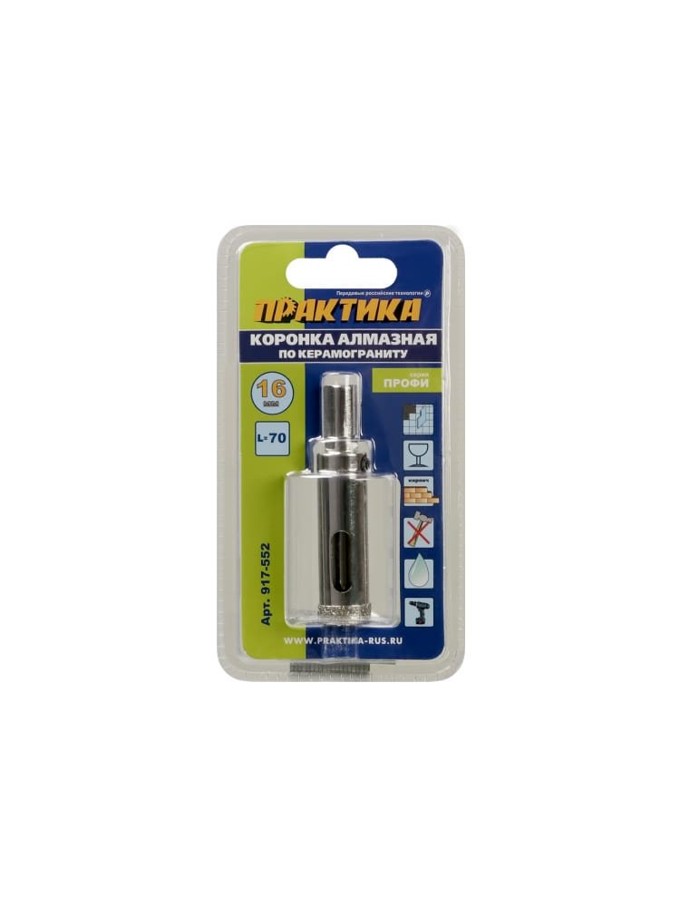 Полупрофессиональная коронка диаметром 16 мм — ваш надежный помощник при сверлении керамогранита, керамической плитки, стекла и эмали. Оптимально подходит для монтажных и отделочных работ, позволяя создавать аккуратные отверстия для розеток, выключателей, а также креплений. Высокоточное пилотное сверло обеспечивает легкий старт сверления без смещения и сколов, что гарантирует профессиональный результат даже при работе на сложных поверхностях.