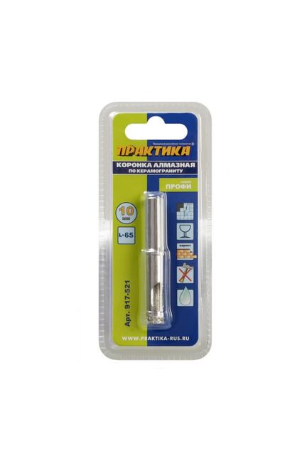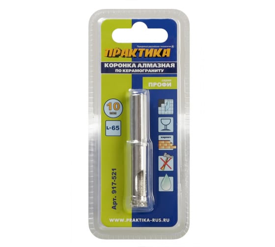 Коронки алмазные по керамограниту. Серия "Профи". Коронка алмазная (сверло трубчатое) предназначена для сверления керамогранита, керамической плитки, изделий из керамики. Ограниченно подходит для сверления толстого стекла. Трубчатые сверла диаметром 5-14мм не имеют направляющего сверла, потому рекомендуется работать с помощью направляющего кондуктора. Коронки диаметром 16-120 имеют направляющее твердосплавное сверло по плитке для сверления мягкой керамики и облицовочной плитки без кондуктора. При сверлении керамогранита направляющее сверло необходимо снять, воспользовавашись кондуктором или производя засверливание под углом. Запрещено работать в ударном режиме и без охлаждения водой. Необходимо ограничивать скорость подачи и частоту оборотов во избежание перегрева коронки. Для работы лучше всего использовать аккумуляторную дрель имеющую высокий крутящий момент в сочетании с невысокими оборотами. Использовать охлаждение водой. Рекомендуемая частота оборотов от 150 до 1000 об/мин в зави