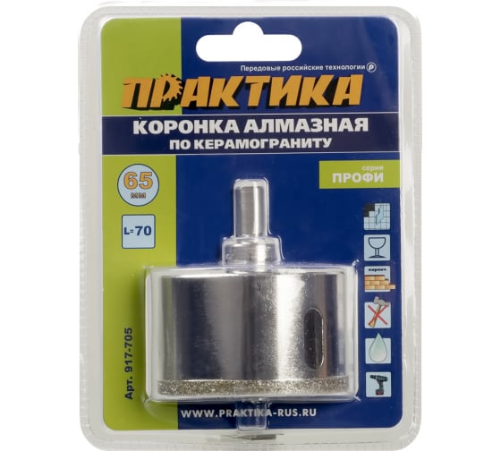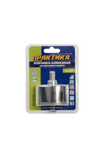 Коронки алмазные по керамограниту. Серия "Профи". Коронка алмазная (сверло трубчатое) предназначена для сверления керамогранита, керамической плитки, изделий из керамики. Ограниченно подходит для сверления толстого стекла. Трубчатые сверла диаметром 5-14мм не имеют направляющего сверла, потому рекомендуется работать с помощью направляющего кондуктора. Коронки диаметром 16-120 имеют направляющее твердосплавное сверло по плитке для сверления мягкой керамики и облицовочной плитки без кондуктора. При сверлении керамогранита направляющее сверло необходимо снять, воспользовавашись кондуктором или производя засверливание под углом. Запрещено работать в ударном режиме и без охлаждения водой. Необходимо ограничивать скорость подачи и частоту оборотов во избежание перегрева коронки. Для работы лучше всего использовать аккумуляторную дрель имеющую высокий крутящий момент в сочетании с невысокими оборотами. Использовать охлаждение водой. Рекомендуемая частота оборотов от 150 до 1000 об/мин в зави