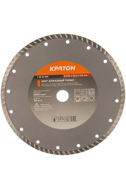 Назначение: бетон, железобетон, гранит, мрамор, кирпич, керамика. ТУРБО применяется для сухой и мокрой резки. Обеспечивают быстрый рез и чистоту получаемой кромки. Для резки бетона, кирпича, камня. Диаметр 230 мм, посадка 22,2 мм, толщина 2,4–2,6 мм. Чистый рез, износостойкость, подходит для профессионалов.