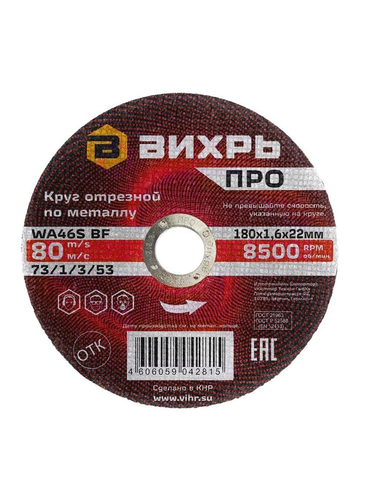 Круг отрезной по металлу ВИХРЬ ПРО 180х1,6х22 мм