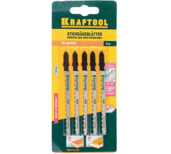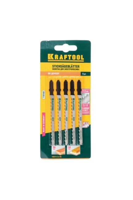 Пилки для электролобзика, Cr-V, по дереву, фанере, ламинату, фигурный рез, EU-хвостовик, шаг 2,5 мм, 75 мм, 2 шт. Kraftool 159514-2,5 имеют хвостовик европейского стандарта. Это обеспечивает совместимость с большинством современных устройств. Пилки T101AO для лобзика: точный фигурный рез, 75 мм, для дерева, фанеры и ДСП, 2 шт. в комплекте — чистый срез и надежное качество работы.