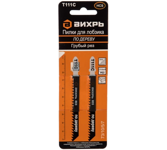Пилки для лобзика Т111C Вихрь используются с электролобзиками для выполнения грубого пропила различных пород дерева, толщиной от 4 до 50 мм. Пилки для лобзика: быстрый грубый рез по дереву, прочная сталь, длина 100 мм, толщина до 75 мм, 2 штуки, подходит большинству лобзиков.