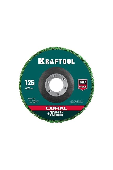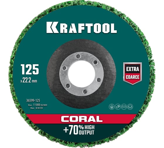 Полимерно-шлифовальный синтетический абразивный круг KRAFTOOL Coral 125x22.2 мм 36599-125 обладает максимально возможной производительностью при зачистке металла и древесины от ржавчины, застарелых лакокрасочных покрытий,грунтовок и других отделочных материалов. Эффективная шлифовка металла, пластика и дерева, долгий ресурс, размер 125×22 мм, подходит для УШМ, минимальный нагрев и ровный износ.