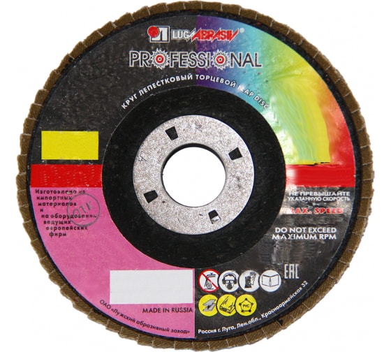 Круг лепестковый торцевой плоский КЛТ1 Луга предназначен для ручных шлифовальных машин. Применяется для плоского шлифования, обработки кромок и сварных швов деталей и конструкций из различных марок сталей, цветных металлов и древесины. Круг работает тихо, устойчиво, без прижогов, оставляя холодными обработанные поверхности, обеспечивает максимальный съем материала. Абразив – электрокорунд, марка А 120. Зернистость по ГОСТ – 14А 12, зернистость по FEPA – P120.