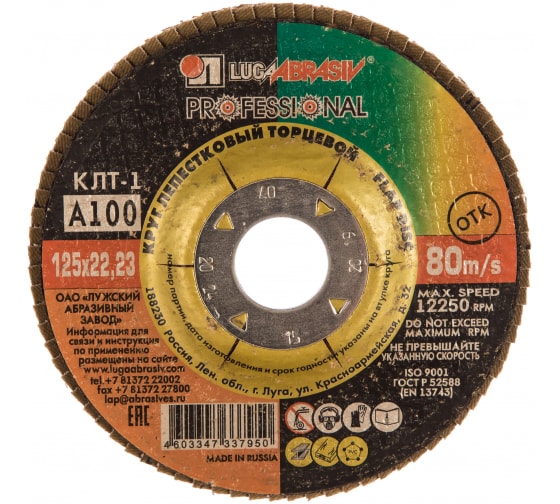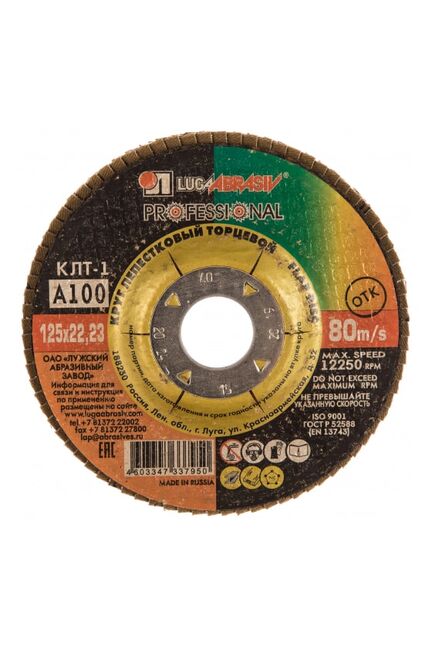 Круг лепестковый торцевой плоский КЛТ1 Луга предназначен для ручных шлифовальных машин. Применяется для плоского шлифования, обработки кромок и сварных швов деталей и конструкций из различных марок сталей, цветных металлов и древесины. Круг работает тихо, устойчиво, без прижогов, оставляя холодными обработанные поверхности, обеспечивает максимальный съем материала. Абразив – электрокорунд, марка А 120. Зернистость по ГОСТ – 14А 12, зернистость по FEPA – P120.