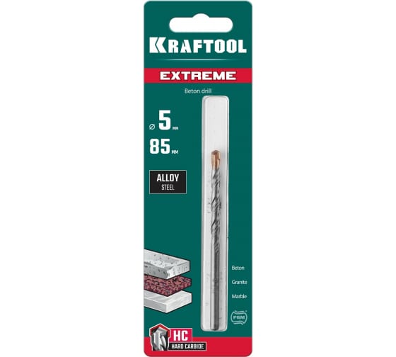 Сверло по бетону KRAFTOOL Extreme 5x85 мм 29166-085-05 - ударное сверло,сочетающее в себе максимальный срок службы и отличные характеристики засверливания. Сверхпрочная пластина из твердого сплава и корпус из закалённое стали позволяют уверенно сверлить бетон,гранит,камень,кирпич. Сверло: для аккуратного сверления бетона, кирпича и камня, прочное твердосплавное острие, высокая скорость и минимальный износ, диаметр 5 мм.