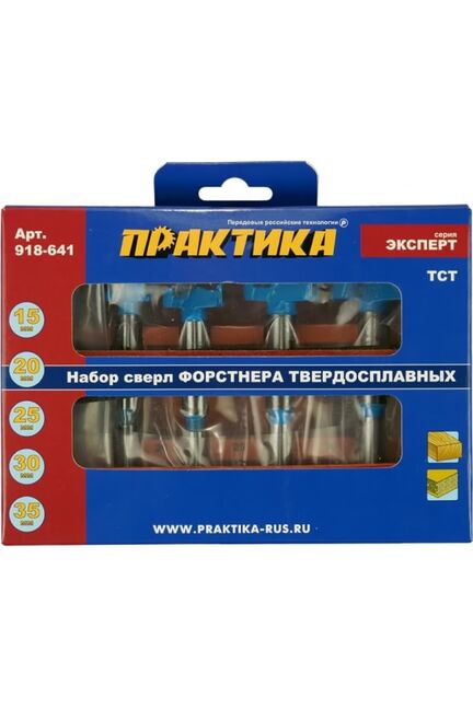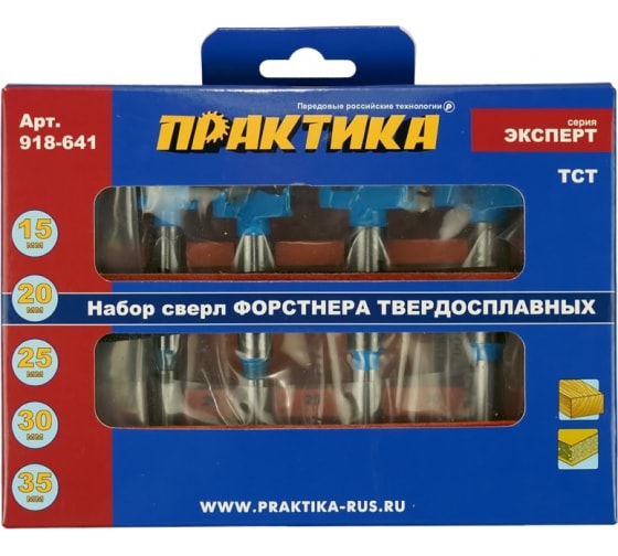 Набор сверл Форстнера ПРАКТИКА 5шт, твердосплавных 15, 20, 25, 30, 35 мм, в дер. кейсе