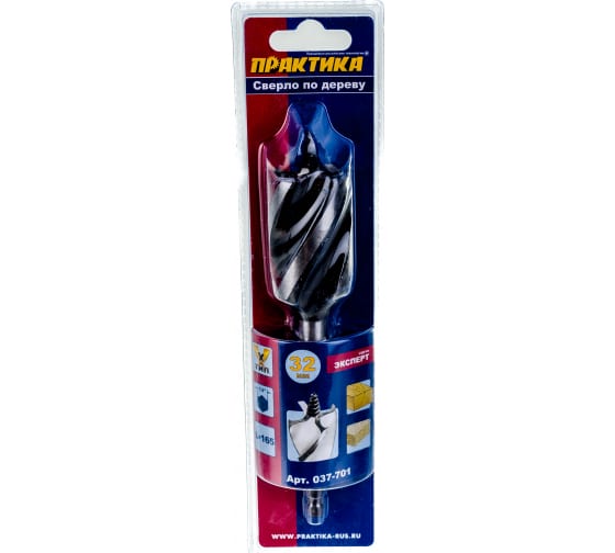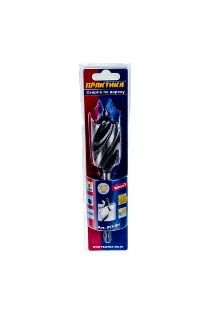 Сверло по дереву X-тип (32x165 мм; в блистере) ПРАКТИКА предназначено для сверления мягкой древесины и древесины средней твердости, ограниченно ДСП и гипсокартона. Изготовлено из высококачественной инструментальной стали У10. Четыре режущие кромки и четырехзаходная спираль обеспечивают высокую скорость сверления и аккуратные кромки отверстия. Резьбовое центрирующее острие обеспечивает самозатягивание сверла в материал, снижая усилия оператора. Шестигранный хвостовик 1/4’’ исключает проворачивание в кулачковом патроне и подходит для использования совместно с магнитным держателем 1/4’’.