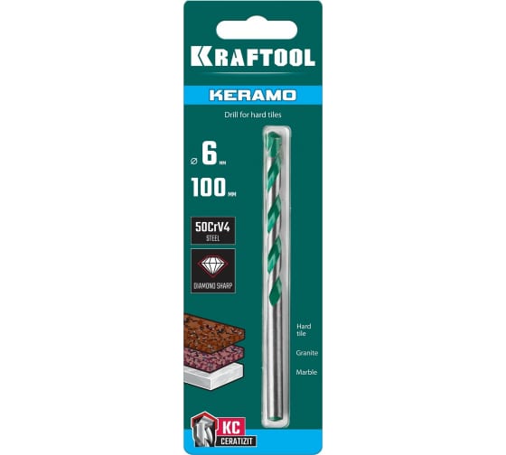 Сверло по керамограниту KRAFTOOL Keramo 6x100 мм 29175-100-6 благодаря специальной твердосплавной пластине и алмазной заточке режущих кромок уверенно проходит через керамогранит,мрамор,гранит и прочие твердые материалы. Используется с дрелями и перфораторами со сверлильным патроном в безударном режиме сверления. При работе по бетону и кирпичу допускается сверление с ударом. Универсальное сверло 6×100 мм для керамогранита и плитки с твёрдосплавной напайкой, обеспечивает чистое сверление без сколов и трещин.
