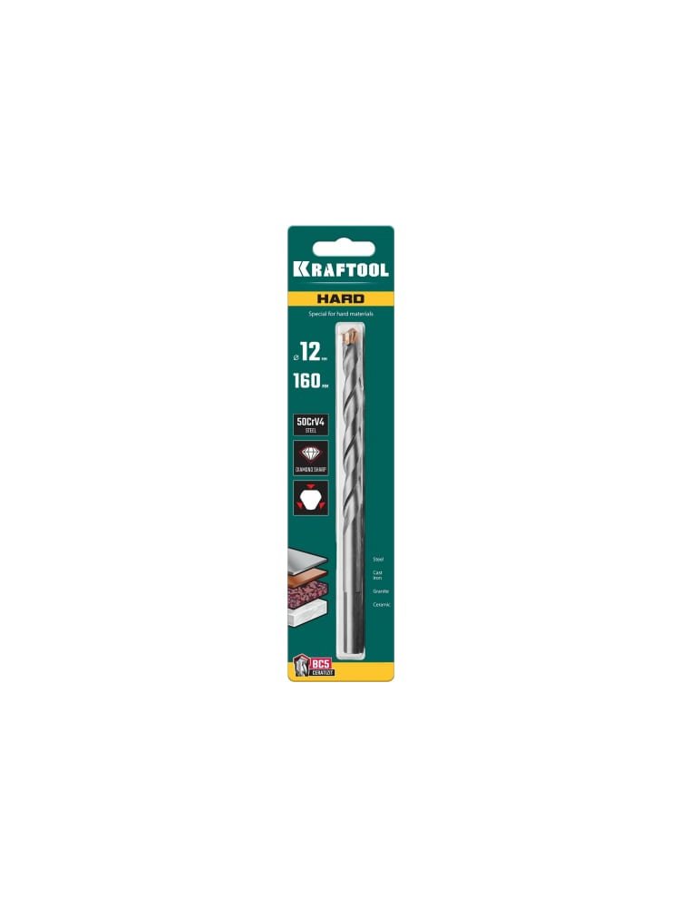 Сверло специальное по твёрдым материалам KRAFTOOL Hard 12x160 мм 29177-160-12 подходит для сверления быстрорежущих сталей, подшипниковой стали,чугуна,керамики,гранита,а также бетона и кирпича. Используется с дрелями и перфораторами со сверлильным патроном в безударном режиме сверления. При работе по бетону и кирпичу допускается сверление с ударом. Прочное твердосплавное сверло диаметр -12 мм для бетона, кирпича и керамики; высокая износостойкость и точное сверление, длина 160 мм.