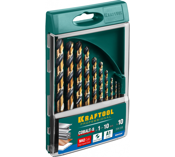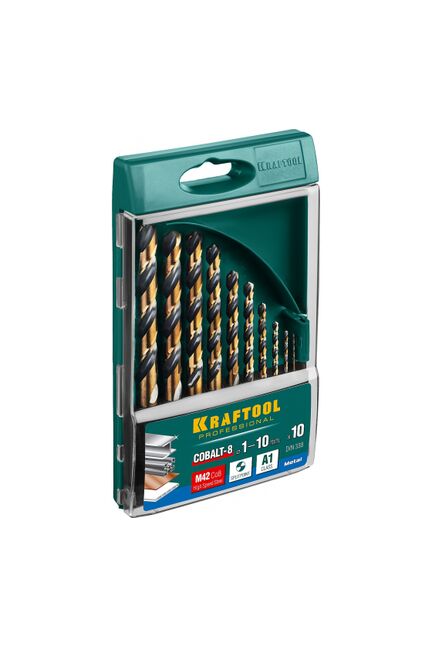 Набор сверл по металлу COBALT HSS-Co(8%) сталь М42(S2-10-1-8) 10шт(1-10мм) KRAFTOOL 29656-H10 Сверла по металлу Кraftool сочетают в себе инновационную технологию и бескомпромиссное качество. Материал: быстрорежущая сталь HSSCo (М42 Кобальтовые сверла 1-10 мм для металла, 10 шт., устойчивые к износу и перегреву, подходят для нержавейки и твёрдых сплавов, идеальны для профессионалов.