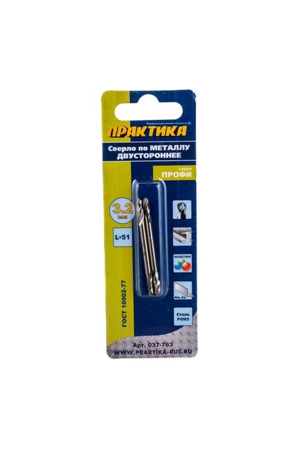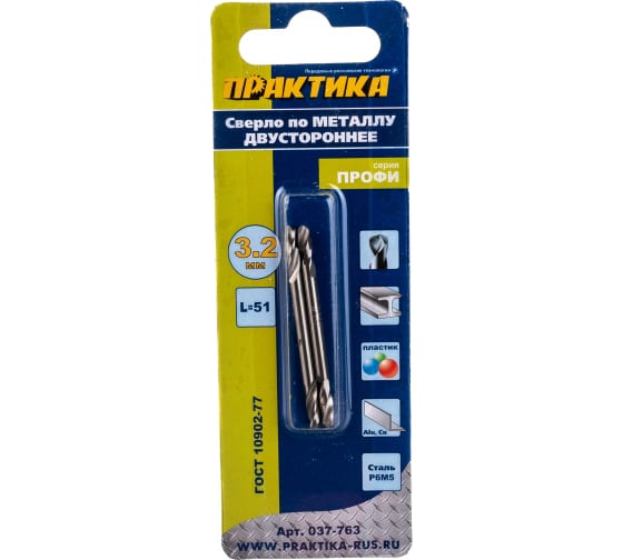 Сверло по металлу двустроннее ПРАКТИКА 3.2*51 мм, P6M5, 2 шт