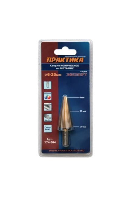Сверло конусное (6-20 мм) ПРАКТИКА изготовлено из высококачественной быстрорежущей стали Р6М5 и предназначено для получения отверстий в листовых металлических и пластиковых материалах. Покрытие нитридом титана значительно увеличивает сопротивление перегреву во время сверления и срок службы сверла. Рекомендуется работать с использованием смазочно-охлаждающих жидкостей.