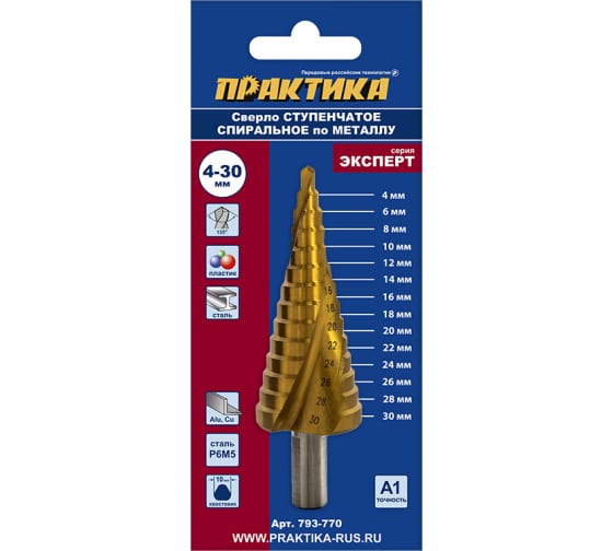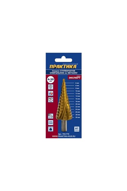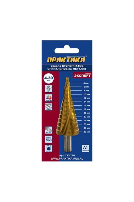 Сверло по металлу ступенчатое спиральное ПРАКТИКА ЭКСПЕРТ, 4-30 мм, шаг 2 мм, хвост 1/4