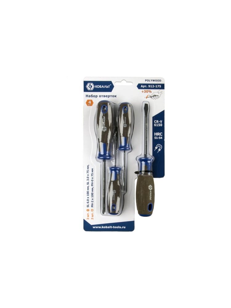 Набор отверток КОБАЛЬТ POLYWOOD, древесно-полимерная рукоятки (4 шт.)