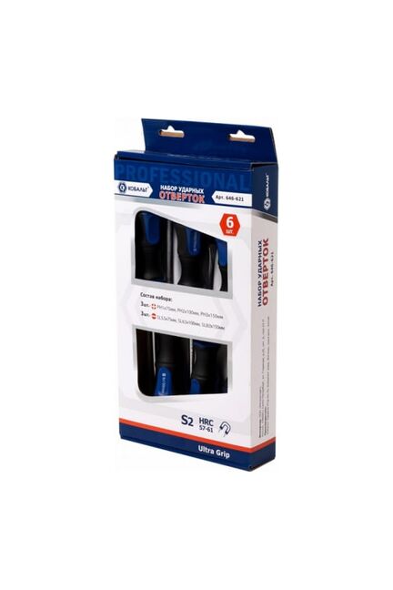 Набор отверток ударных Ultra Grip S2 КОБАЛЬТ предназначен для ремонтных, слесарных работ и починки малых и средних механизмов. Комплект имеет удобно спроектированные формы рукояток и стальные стержни с магнитным наконечником. Набор состоит из 6 отверток:  PH1x75 мм, PH2x100 мм, PH3x150 мм, SL5.5x75 мм, SL6.5x100 мм, SL8x150 мм. Набор ударных отверток S2, Ultra Grip, 6 шт: для мощного откручивания прикипевших крепежей и профессионального монтажа любого уровня сложности.