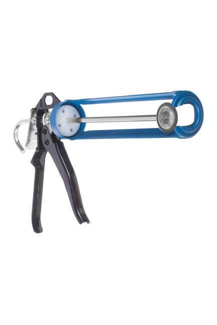 Полукорпусный, усиленный. Материал: корпус и рукоятка - алюминиевый сплав; скелет (2 жестких ребра) - окрашенная сталь; шток - никелированная сталь; пластик. Применение: используется для плавного выдавливания герметиков из тубы объемом 320 мл при нанесении на поверхность для герметизации различных швов и отверстий. Преимущества: для удобства работы возможен поворот на 360°, точная дозировка.