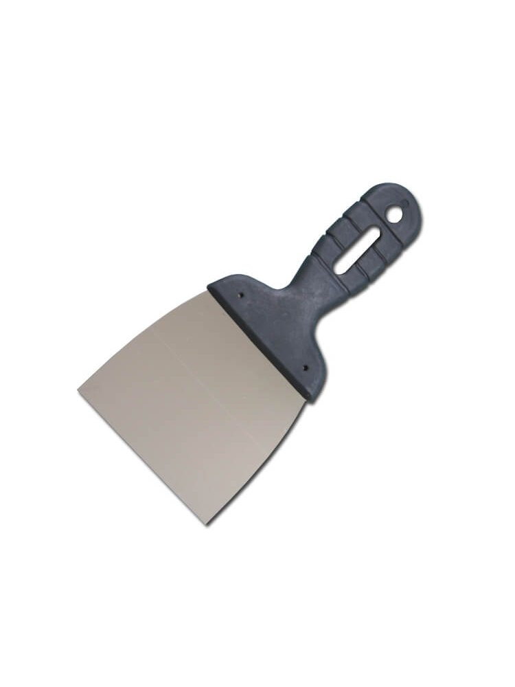 Шпатель из нержавеющей стали, пластмассовая ручка. Назначение: Для заделки швов и трещин, нанесения и выравнивания строительных растворов. Широкий шпатель 100 мм из нержавеющей стали с эргономичной пластиковой ручкой для точного нанесения и легкой очистки, долговечный и удобный.