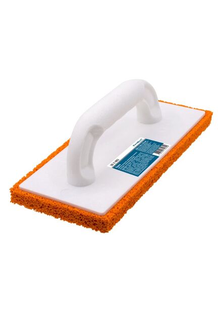 Пластиковое основание из первичного полимерного сырья, накладка из пористой губчатой синтетической резины оранжевого цвета. Применение: для финишной обработки, затирки и шлифования оштукатуренных поверхностей. Губчатая терка для затирки швов плитки и финишной очистки, отличается прочностью, высокой впитывающей способностью и удобной эргономичной ручкой.
