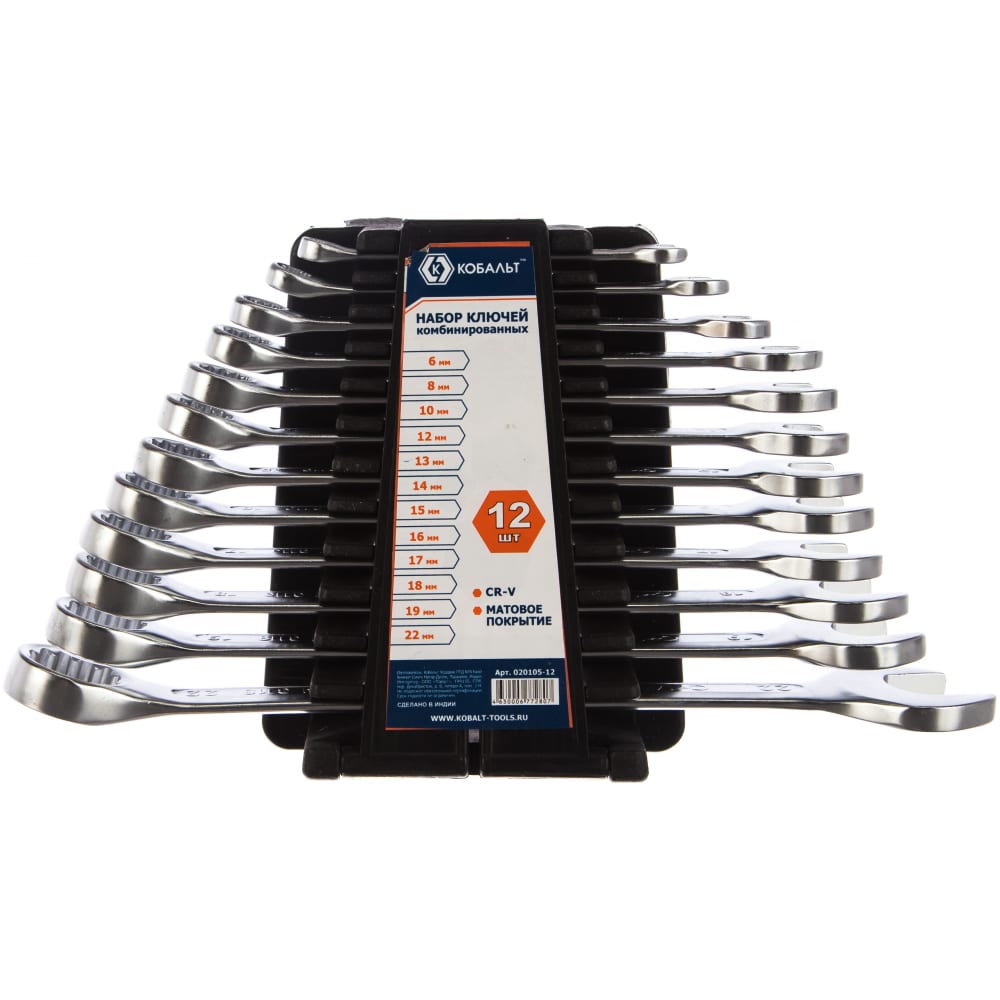 Набор ключей Кобальт позволяет с удобством выполнять откручивание и закручивание резьбовых соединений с шестигранными головками. В набор входят 12 комбинированных ключей с разными размерами захвата от 6 до 22 мм. Изготовленные из хромованадиевой стали и обладающие закаленной поверхностью, ключи отличаются высокими показателями износоустойчивости. Матовое хромовое покрытие предотвращает образование коррозии и позволяет комфортно удерживать ключ в руке. Вместе с ключами Кобальт поставляется пластиковый держатель для удобства эксплуатации.