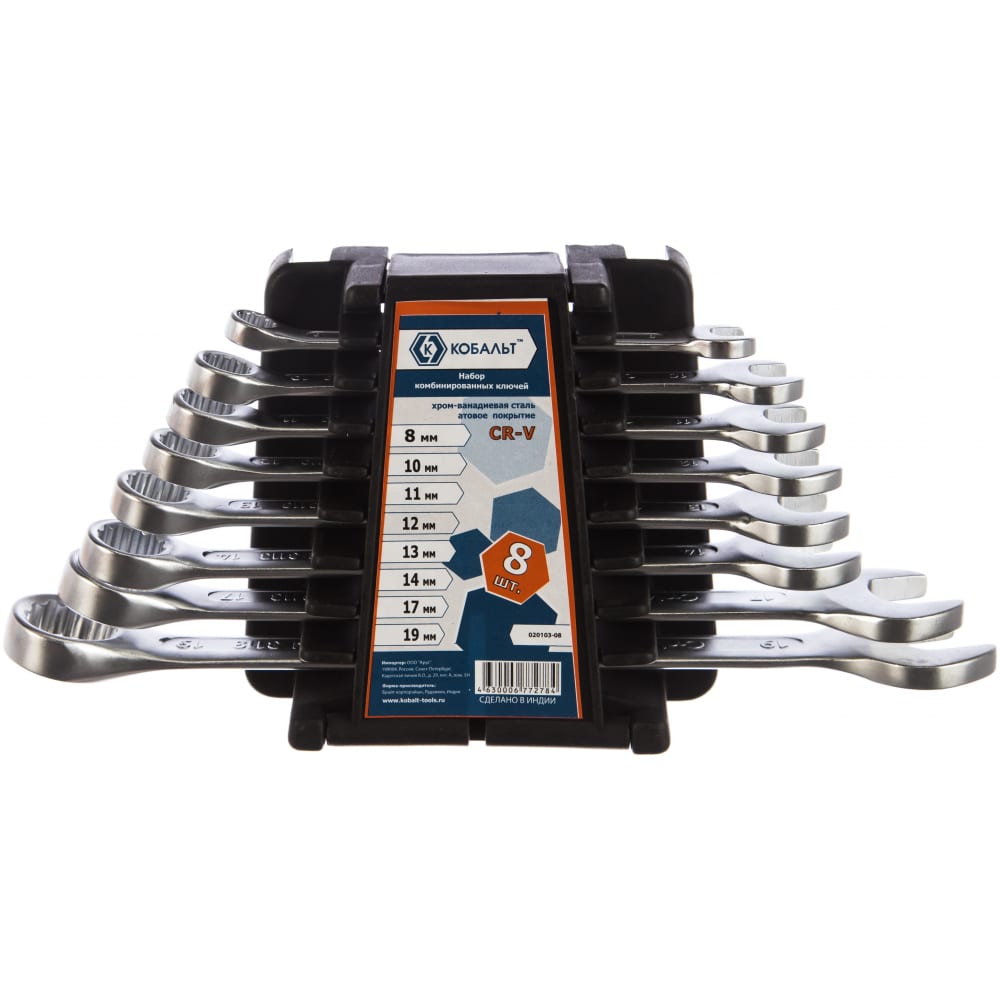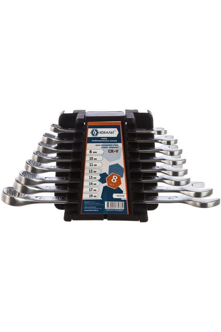 Набор ключей комбинированных 8 шт. КОБАЛЬТ, предназначен для отвинчивания/завинчивания резьбового крепежа с шестигранными головками при производстве строительных, электротехнических, монтажных и автосервисных работ. Изготовлены из хром-ванадиевой стали 31Cr-V, с закалкой рабочих поверхностей до 47-50 HRC. Защитное матовое хромовое покрытие ключей, нанесенное электролитическим способом, предохраняет от коррозии, улучшает внешний вид, при этом ключи не скользят в ладони в процессе работы. Небольшая толщина ключей позволяет отвинчивать узкие гайки и крепеж в труднодоступных местах.
