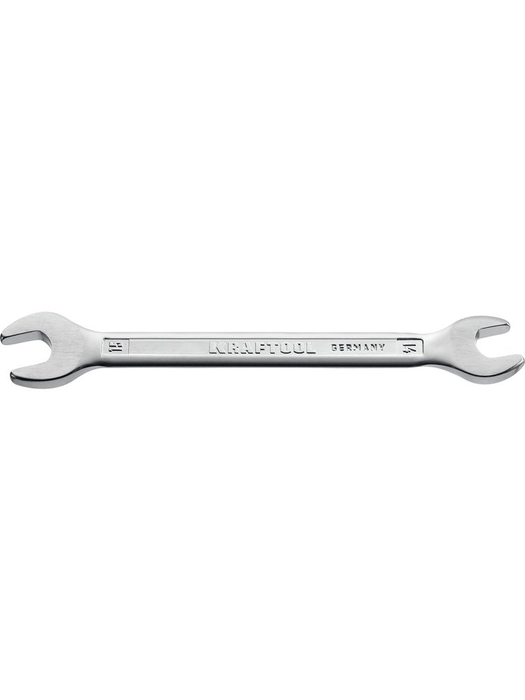 Профессиональный рожковый гаечный ключ 14 x 15 мм KRAFTOOL (арт. 27033-14-15_z01). Инструмент идеально подходит для монтажных, слесарных, сантехнических и ремонтных работ с крепежами стандартных размеров 14 и 15 мм — как дома, так и на строительной площадке.