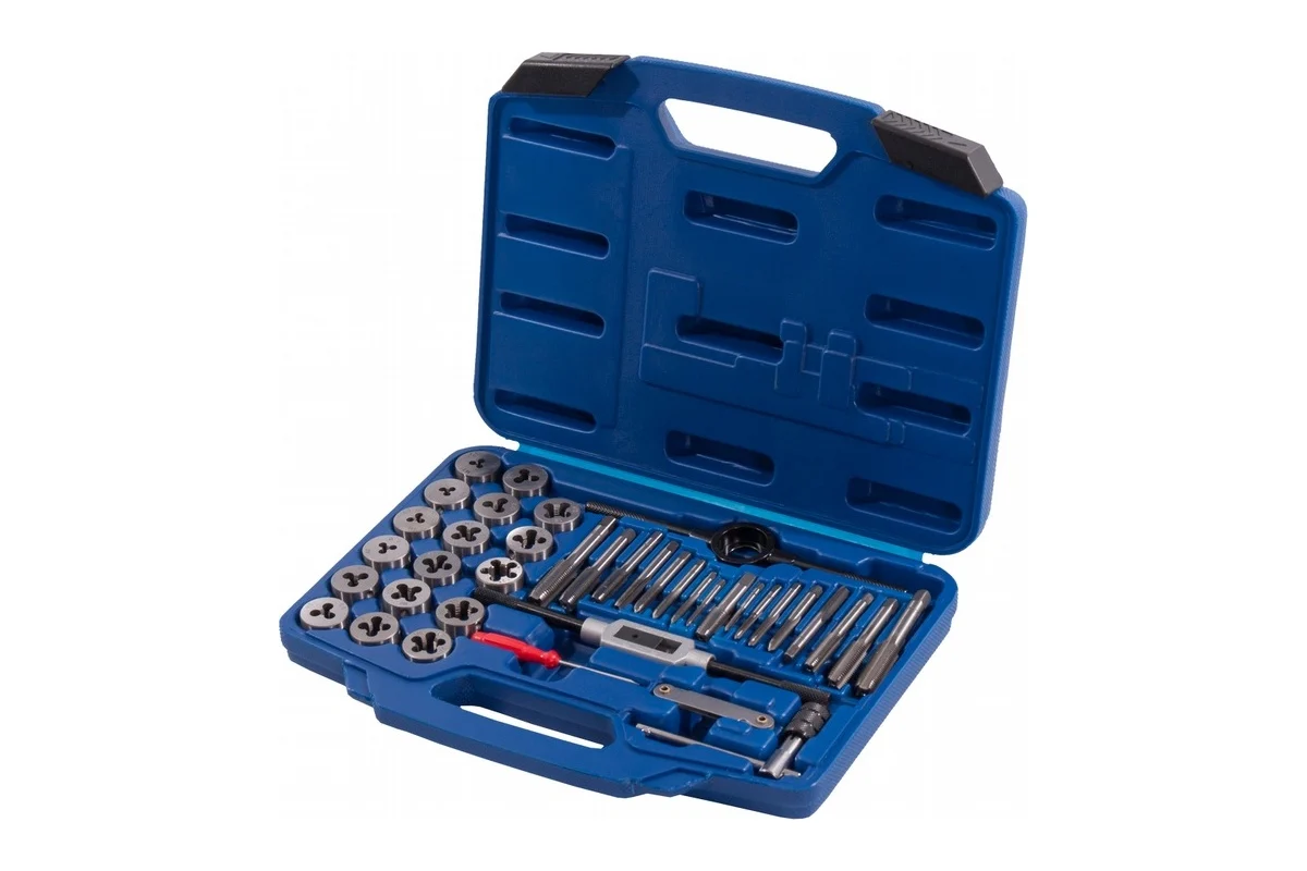 Универсальный набор: 40 предметов, сталь с кобальтом, нарезка резьбы М3–М12, кейс. Прочность, долговечность и комфорт работы на любом объекте.
