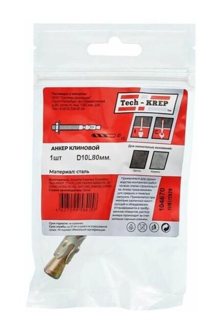 Анкер клиновой 10х80 мм от Tech-Krep представляет собой надежный крепежный элемент, предназначенный для создания прочных соединений в бетоне и других твердых материалах. Изготовлен из высококачественной стали с антикоррозийным покрытием, что обеспечивает долговечность и устойчивость к внешним воздействиям. Конструкция анкера включает клиновой механизм, который при затягивании гайки расширяется внутри отверстия, создавая максимальную фиксацию. Диаметр 10 мм и длина 80 мм делают его универсальным для различных строительных задач. Подходит для установки в предварительно просверленные отверстия, обеспечивая высокую нагрузочную способность.