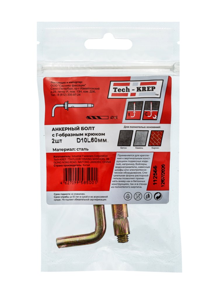 Анкерный болт с Г-образным крюком HL 10x60 (2 шт) от Tech-Krep - надежный крепеж для бетона и кирпича. Диаметр 10 мм, длина 60 мм, антикоррозийное покрытие.